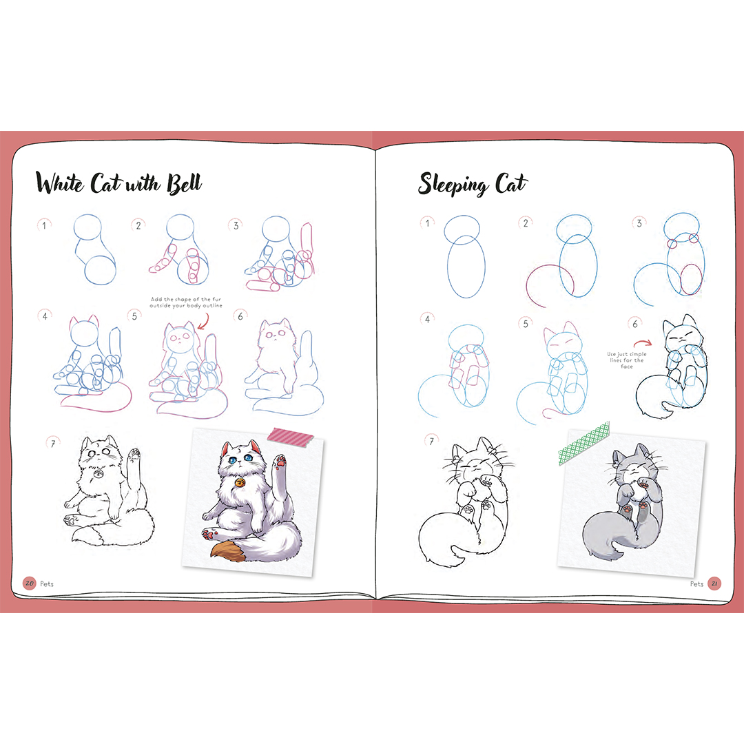 Hvert trin-for-trin-projekt er opbygget i otte enkle trin, der starter med en grov skitse af grundformerne og gradvist udvikler sig til en færdig, farvelagt tegning.
