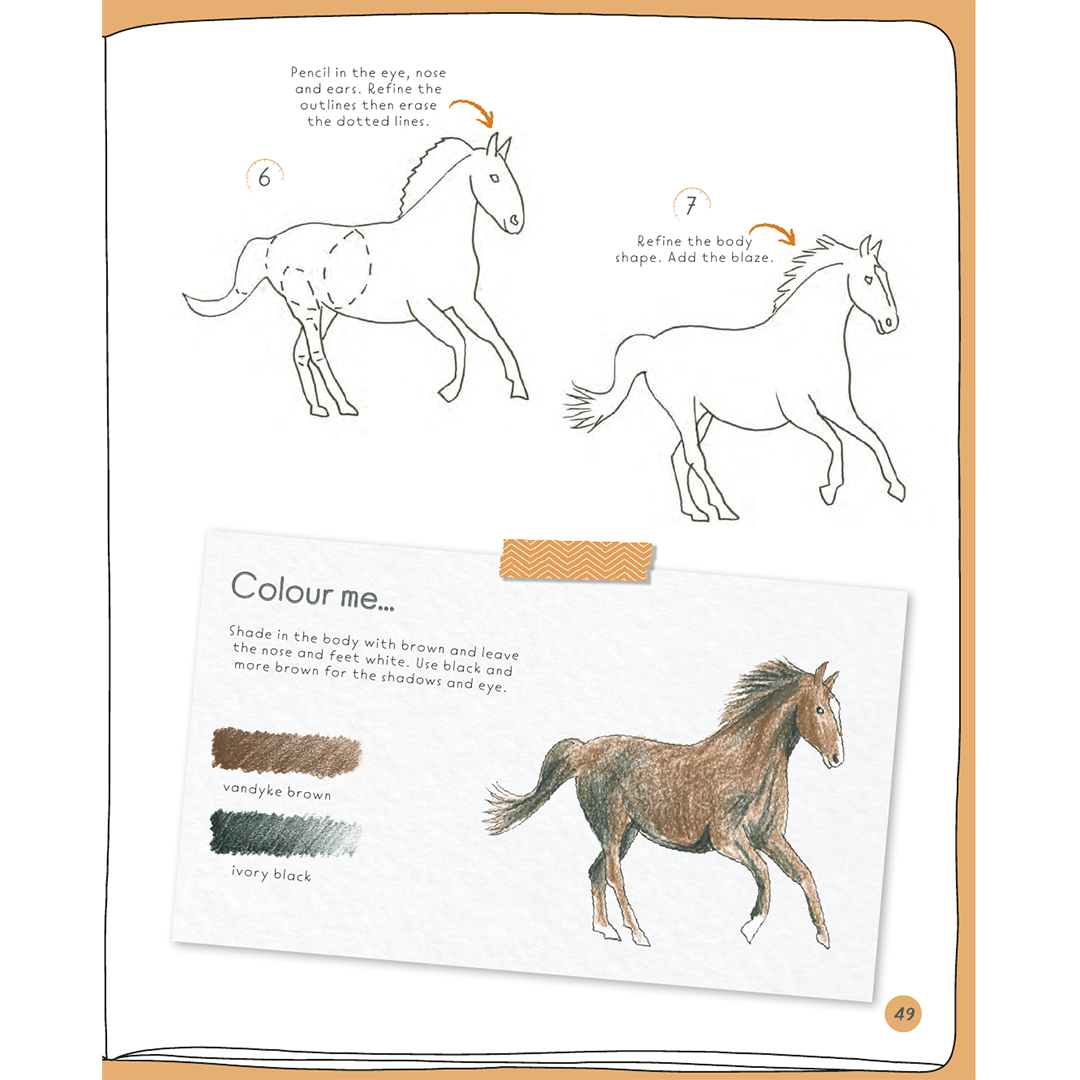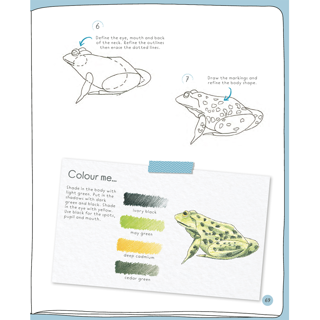 Hvert projekt indeholder mellem 6 og 10 illustrerede trin, enkle instruktioner og en inspirerende “farvelæg mig”-boks med farveprøver og råd, hvis du vil give din færdige tegning farve. I Jonathans eksempler bruges farveblyanter, men du kan bruge hvilket som helst medie.