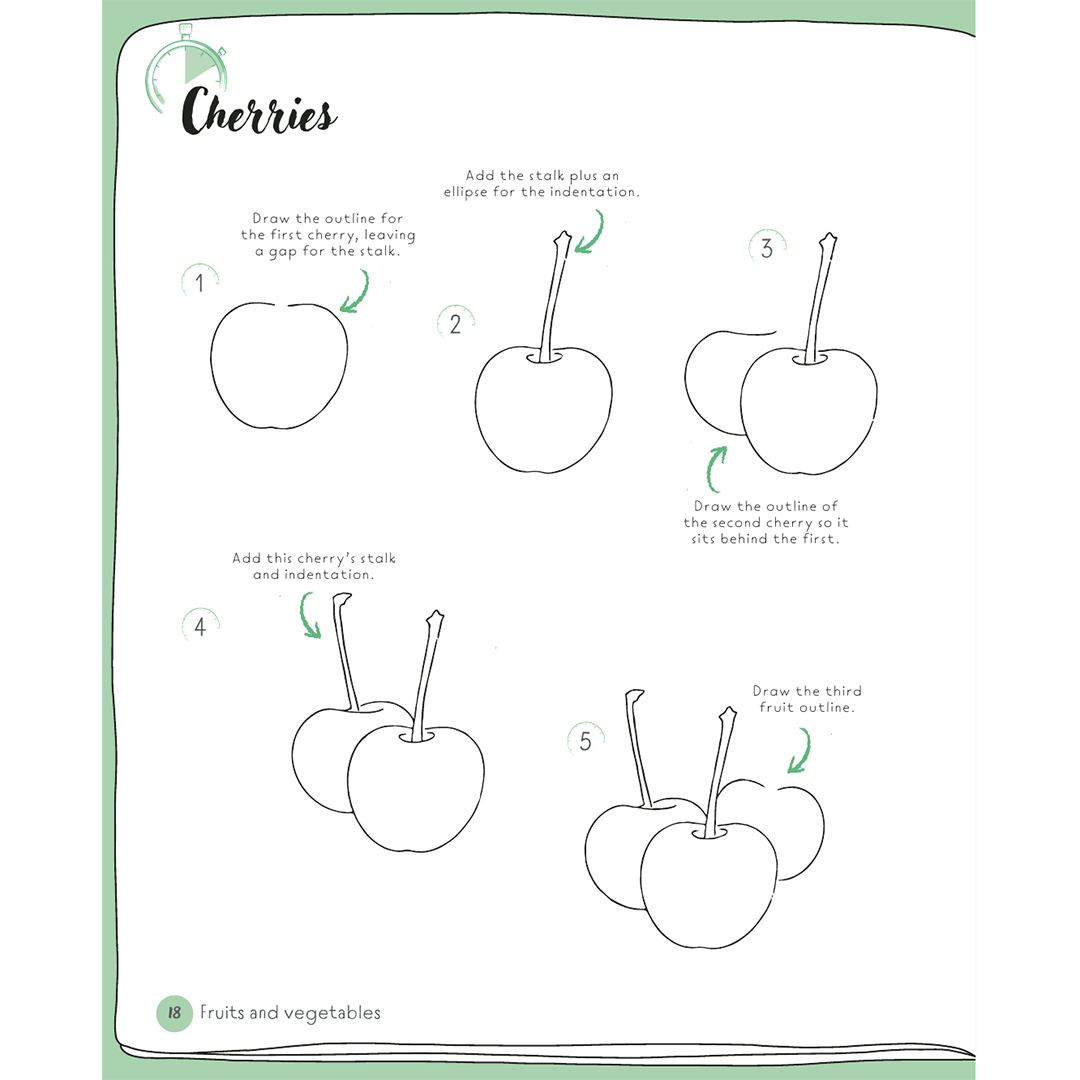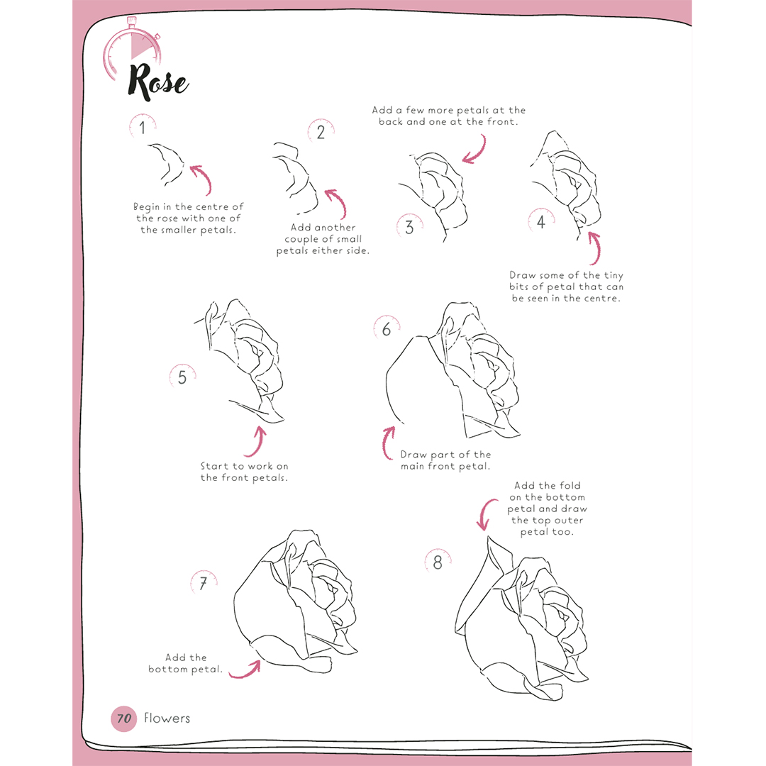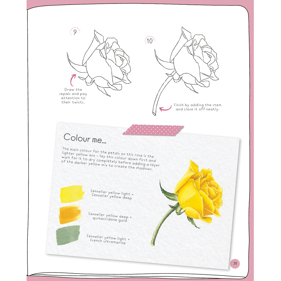 Hvert projekt indeholder mellem 6 og 10 illustrerede trin, enkle instruktioner og en inspirerende “farvelæg mig”-boks med farveblandinger og råd, hvis du vil give din færdige tegning farve – i Emmas tilfælde bruges akvarelfarver, men du kan bruge hvilket som helst medie.