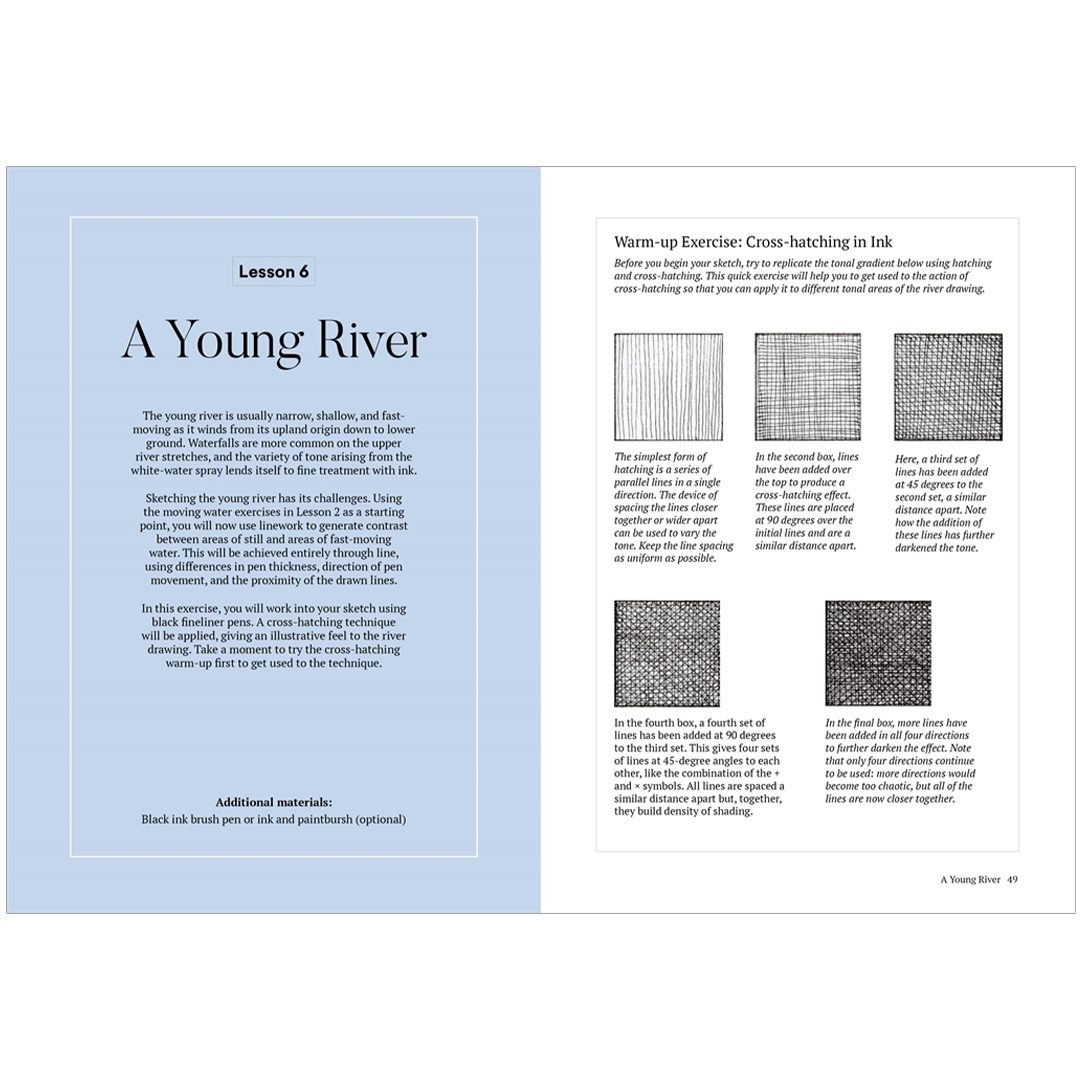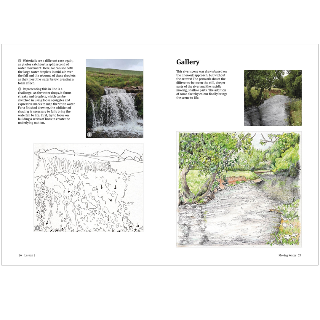 How to Draw a River viser dig, hvordan du fanger vandets strøm, lys og tekstur – fra kilden i bjergene til der, hvor floden løber ud i havet.