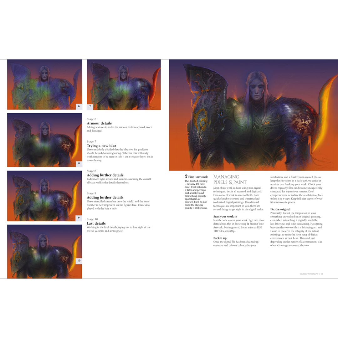 Bogen undersøger også fantasylandskaber og arkitektur samt, hvordan man balancerer lyse og mørke stemninger. Den afsluttende del giver yderligere inspiration og vejledning i, hvordan du præsenterer dit arbejde i forskellige former, herunder filmarbejde, bogomslag og reklame – områder, hvor John Howe har stor erfaring.