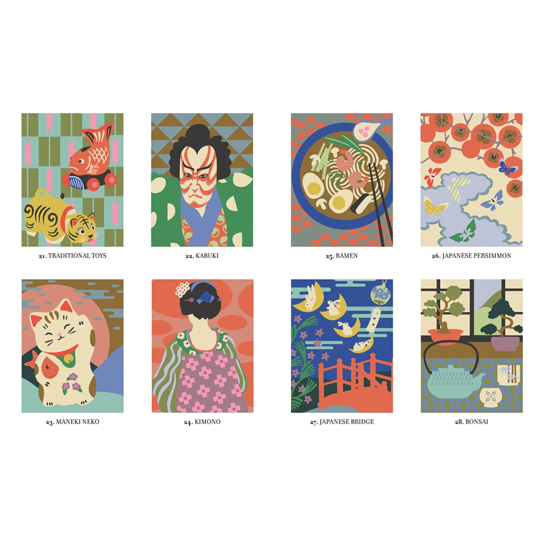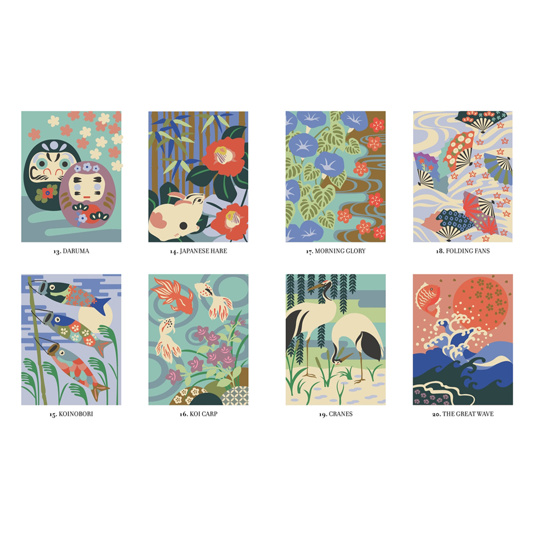 - Hver af de 30 nye og moderne illustrationer viser en farverig side med japansk tema, der fremkommer, når du farvelægger efter tal.