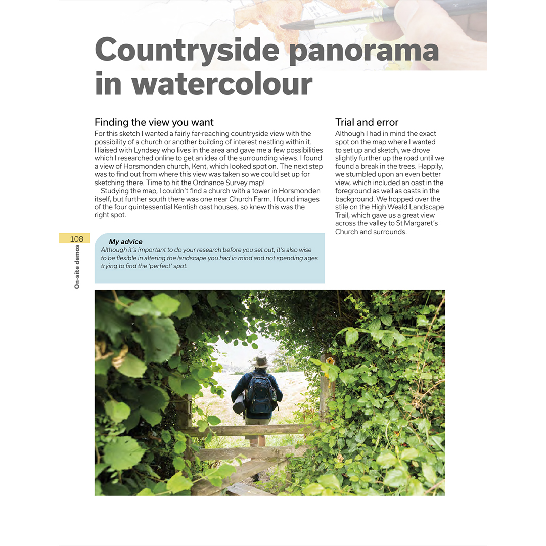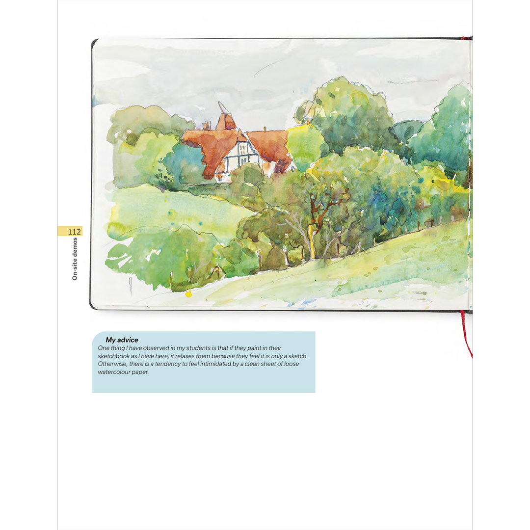Det er en praktisk bog, du vil vende tilbage til igen og igen. Den er fuld af inspirerende kunst og indeholder fem demonstrationer: en kystscene i blæk; et landskabspanorama i akvarel; en typisk engelsk landsby i gouache; et bybillede i linje og akvarelvask; samt træer i akvarelblyanter.