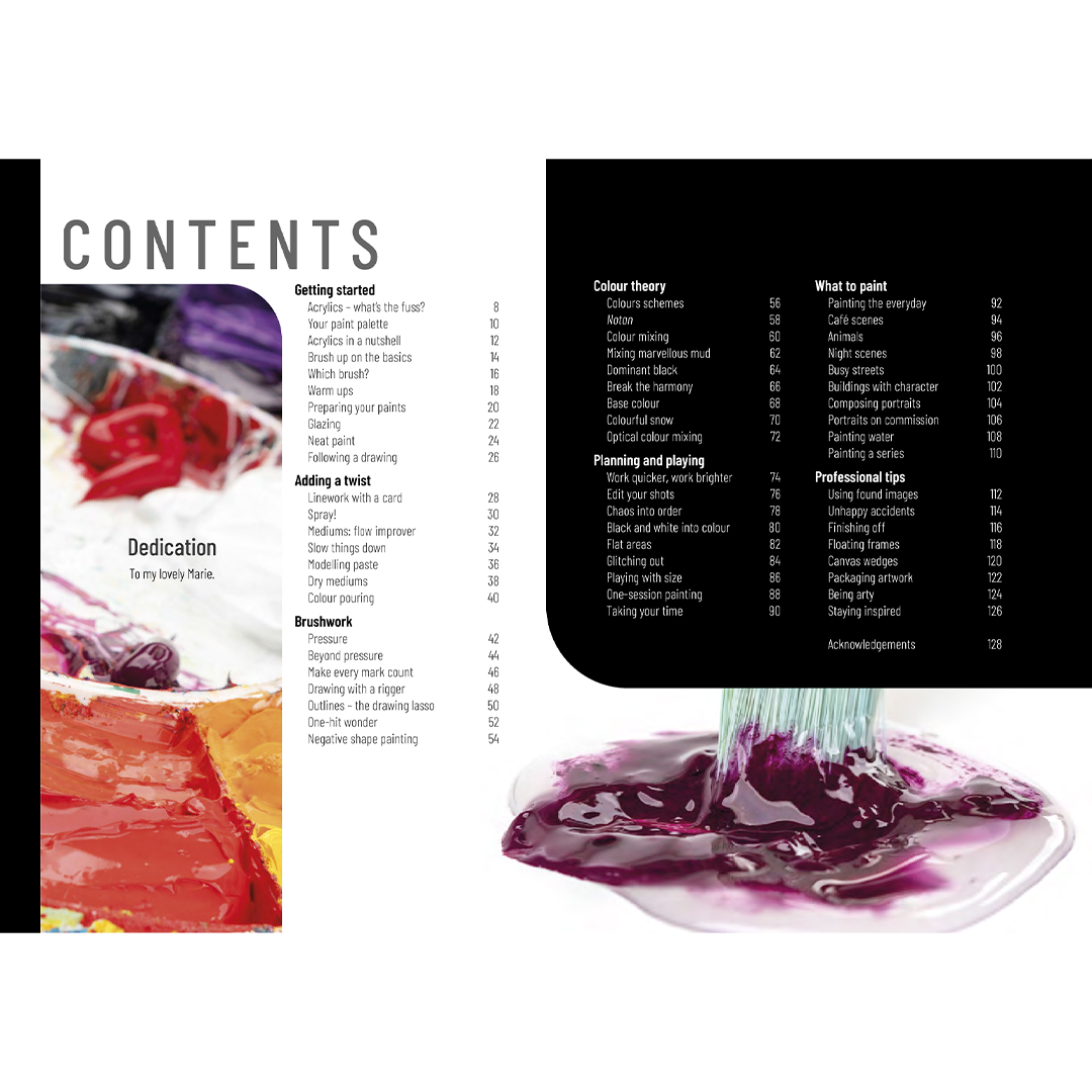 - Få tydelige, visuelle guides til komposition, farvelære og hvordan du bruger forskellige typer akryl, som for eksempel blød, tyk (heavy body) og flere.