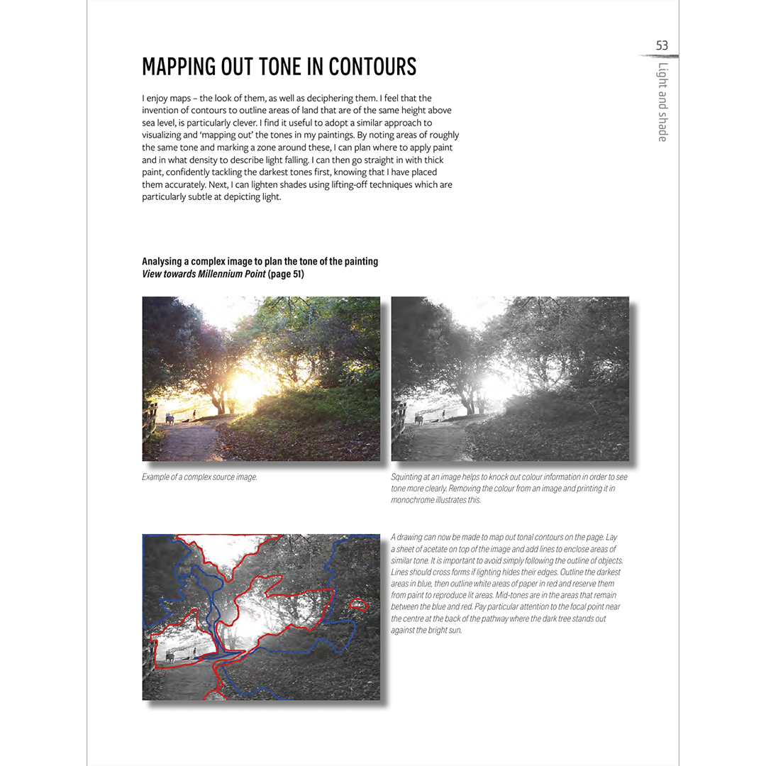 Bogen begynder med en forklaring af teknikken, de anvendte materialer og farver samt vigtigheden af at indfange essensen af et landskab. Den indeholder mange øvelser med stigende sværhedsgrad, demonstrationer og inspirerende færdige malerier, som viser de fængende effekter af reflekser, tåge og skygger – samt de dramatiske forskelle mellem forskellige himle.