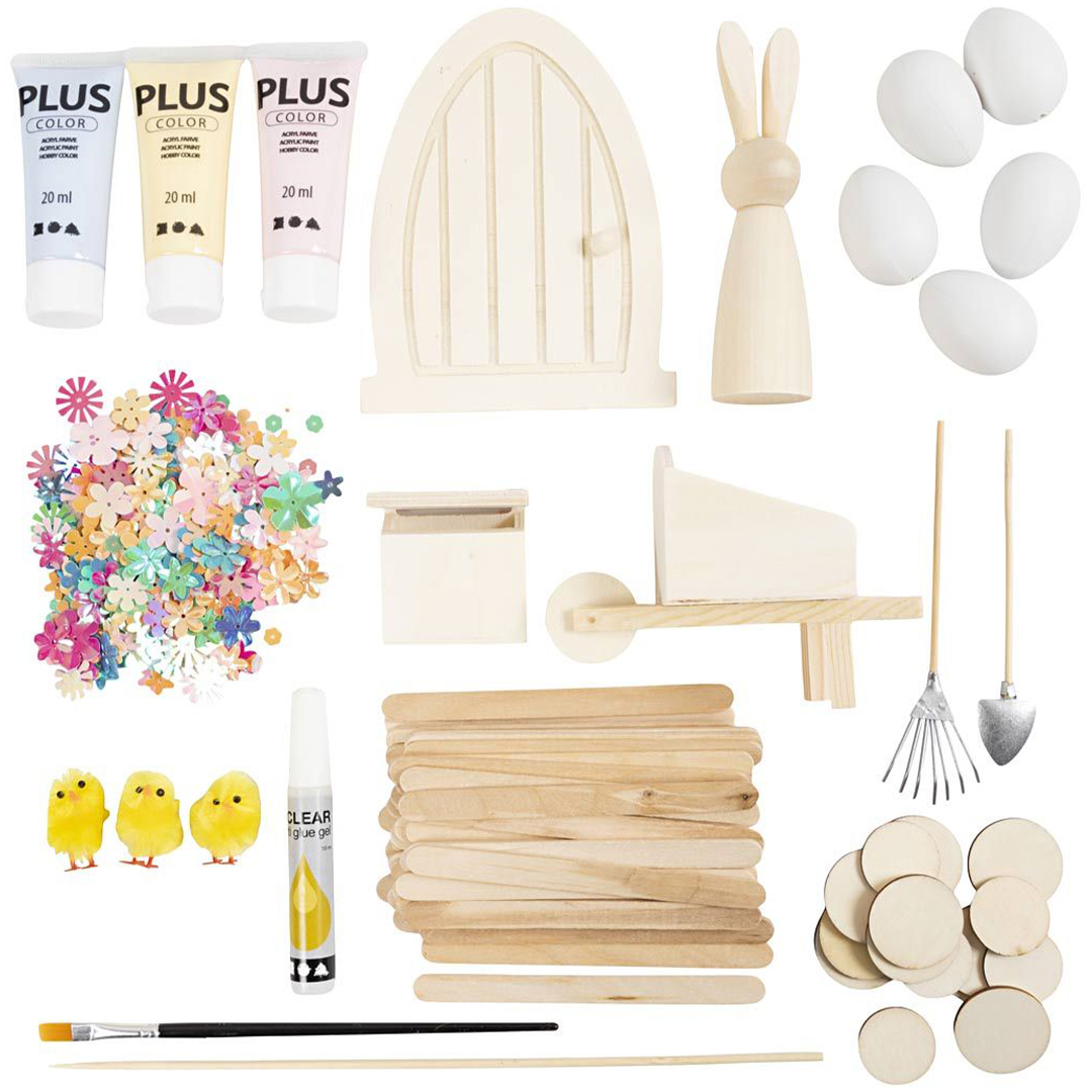 Indhold: dør, hare, postkasse, rive, skovl, trillebør, kyllinger, plastæg, blomsterpaljetter, træskiver, ispinde, blomsterpinde, Plus Colour hobbyfarve, pensel og lim.