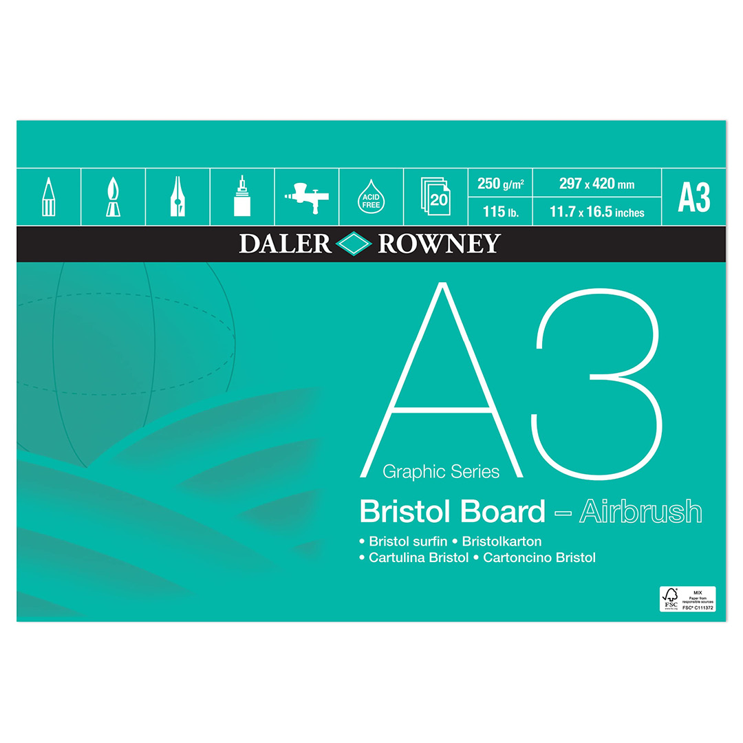 Daler-Rowney Bristol Board er et meget kraftigt bestrøget papir, der er velegnet til airbrush. Fungerer også godt med kridttuscher, blæk, pensel og grafitblyant/farvegrafitblyant. 20 limede ark per blok. Vægt/m2: 250 g.