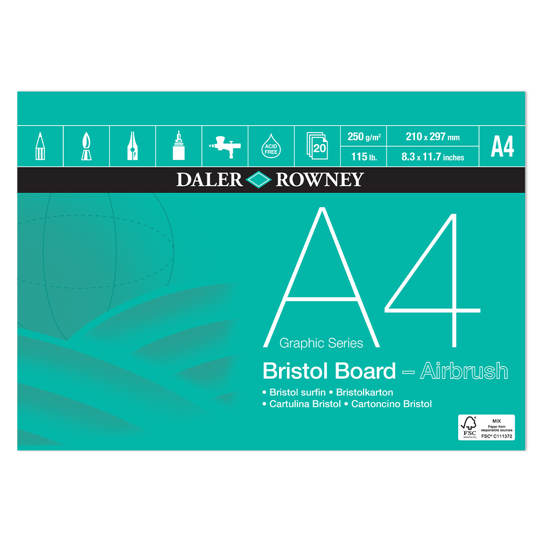 Daler-Rowney Bristol Board er et meget kraftigt bestrøget papir, der er velegnet til airbrush. Fungerer også godt med kridttuscher, blæk, pensel og grafitblyant/farvegrafitblyant. 20 limede ark per blok. Vægt/m2: 250 g.