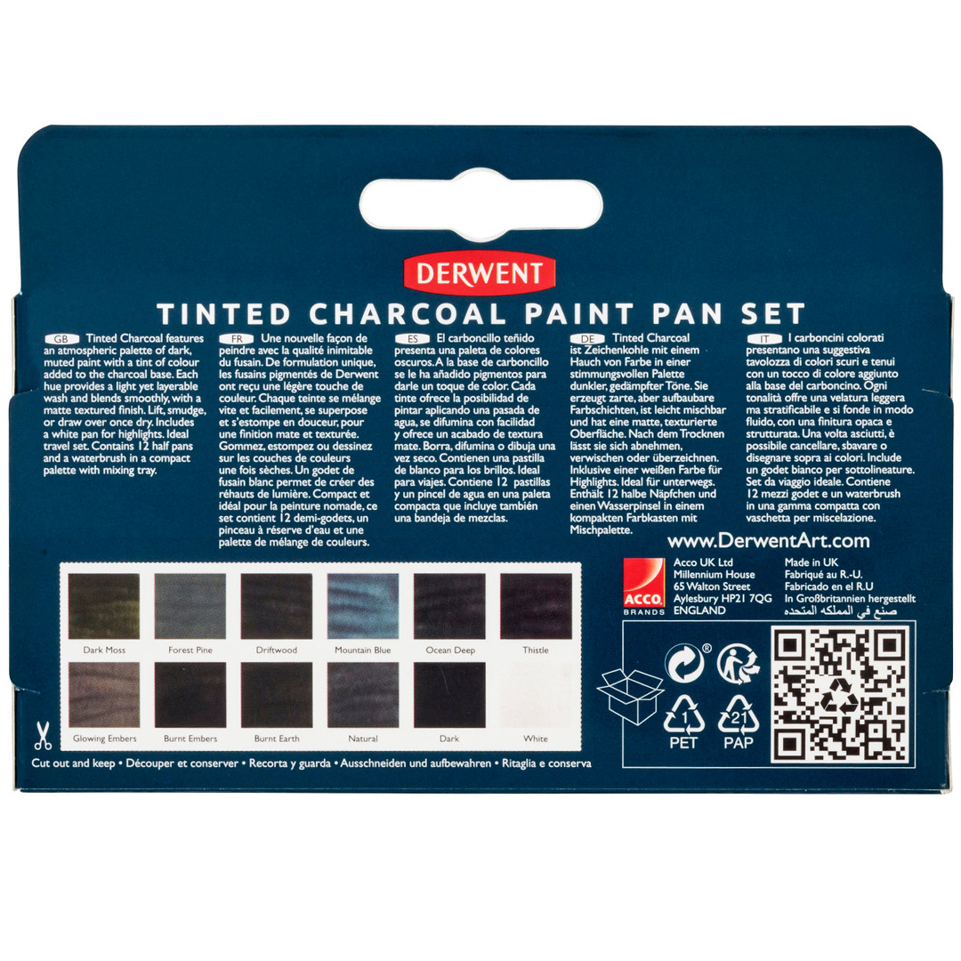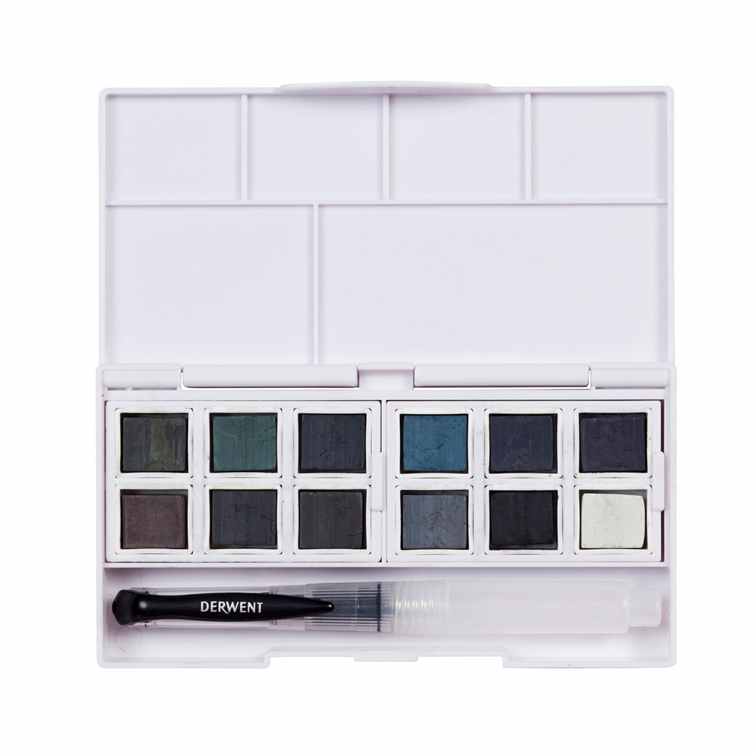 Dette sæt har en særlig formel med vandopløselige kulfarver. Det indeholder 12 mørke og afdæmpede nuancer samt en hvid til highlights. Du kan skabe både farverige toner og transparente overgange. Farverne er matte og let tonede med kullens karakteristiske udtryk, hvilket giver en flot dybde og rumfornemmelse på papiret. Farverne er nemme at påføre våde og blander sig let med hinanden.