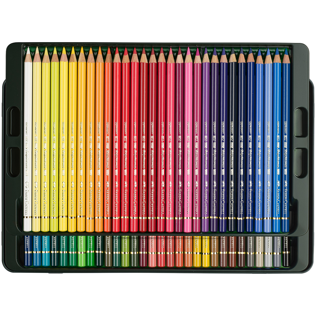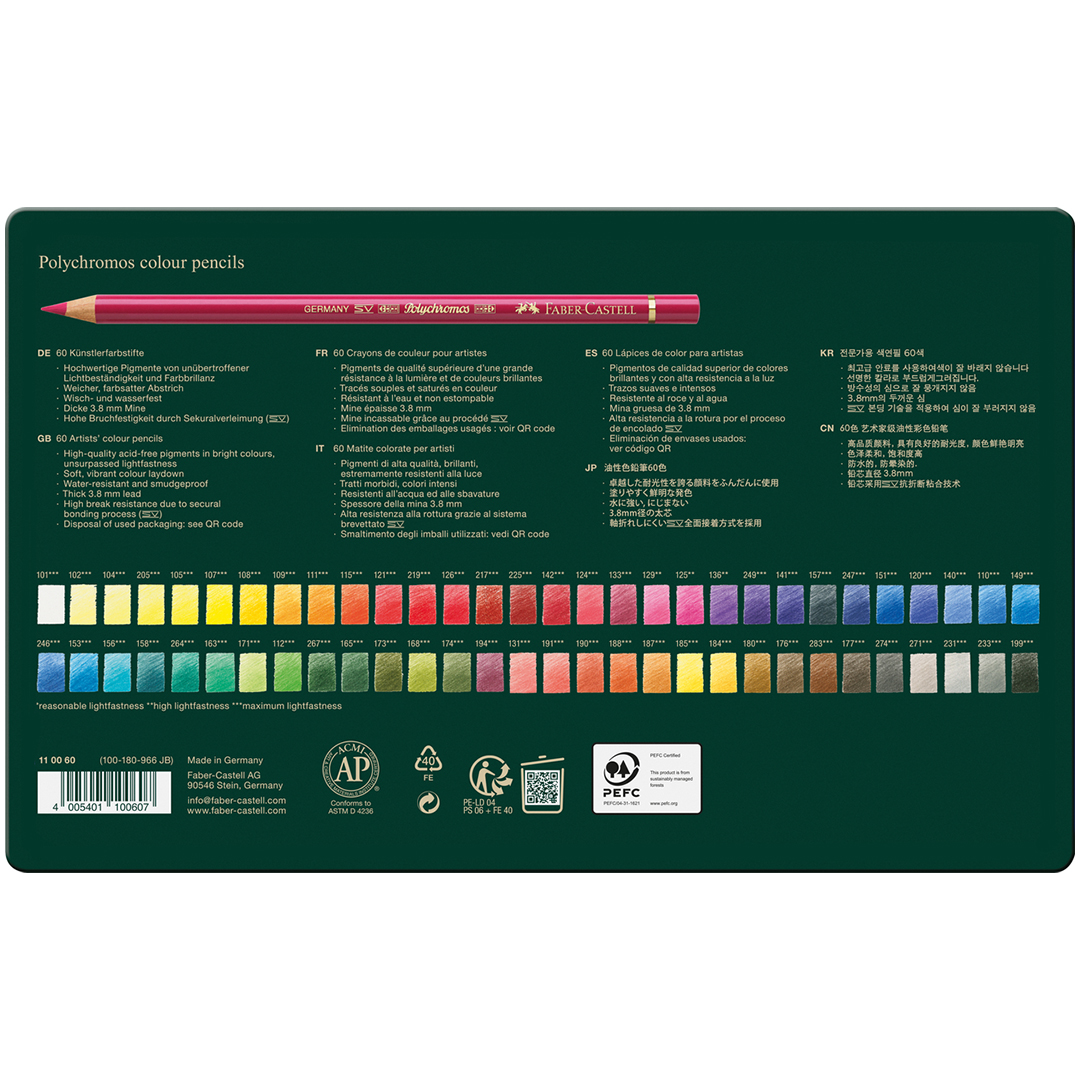 Dette sæt indeholder 60 Polychromos i forskellige farver, pakket i et holdbart metalletui.