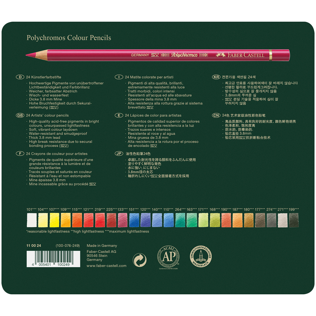 Dette sæt indeholder 24 Polychromos i forskellige farver, pakket i et holdbart metalletui.