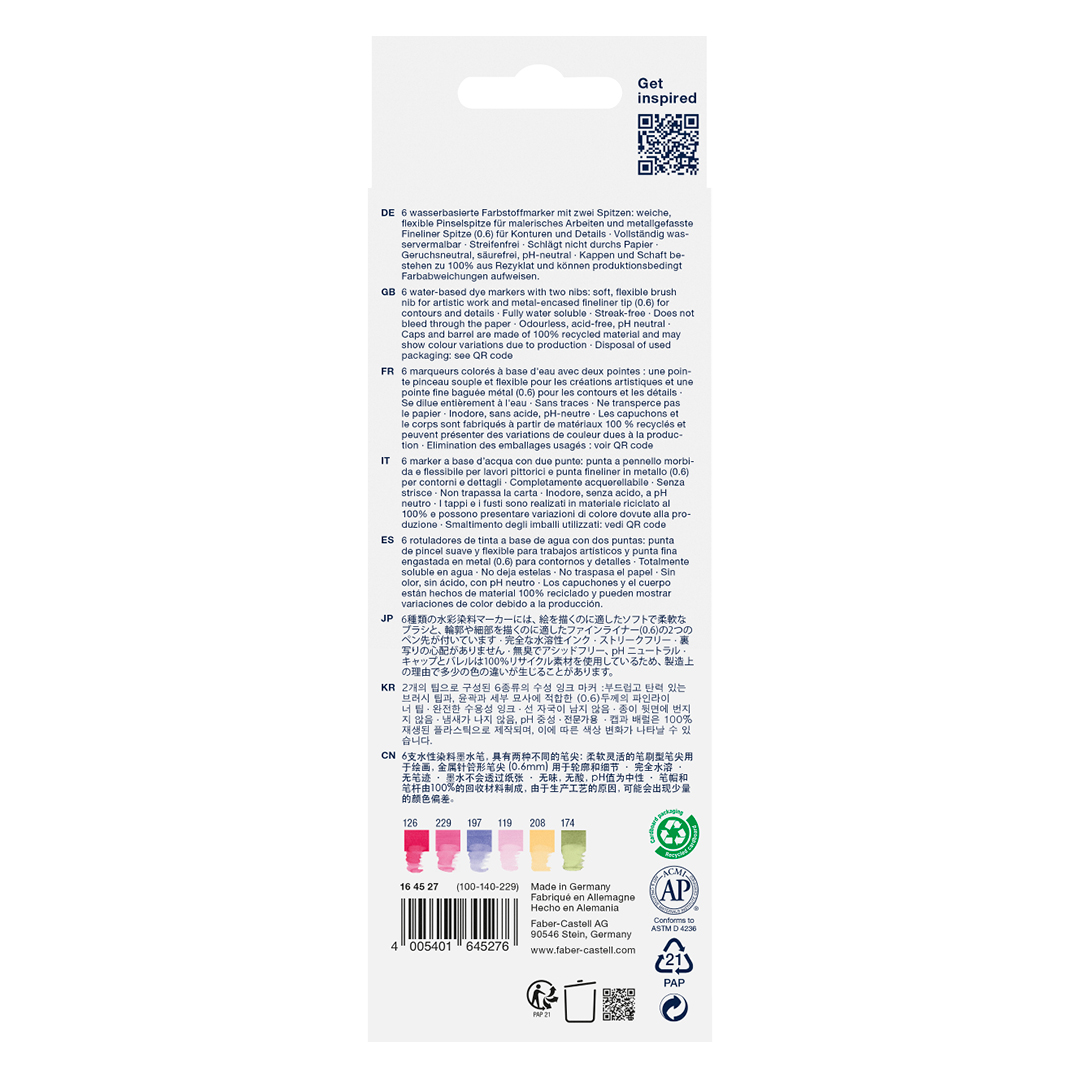 Goldfaber Aqua Dual Marker fra Faber-Castell kombinerer en smal, detaljeret spids med en fleksibel børstespids. Den ultimative kombination til at skitsere, skabe bogstaver og bruge til farvelægning. Blækket er vandbaseret, hvilket betyder, at det ikke bløder gennem papiret, og vandopløseligt, kan bruges til at skabe akvareleffekter på papir. Pennen er også et grønnere valg, da den er lavet af 100% genbrugsplast. Lugtfri, syrefri og pH-neutral blæk. Bredden af ??den smalle spids er 0,4 mm.