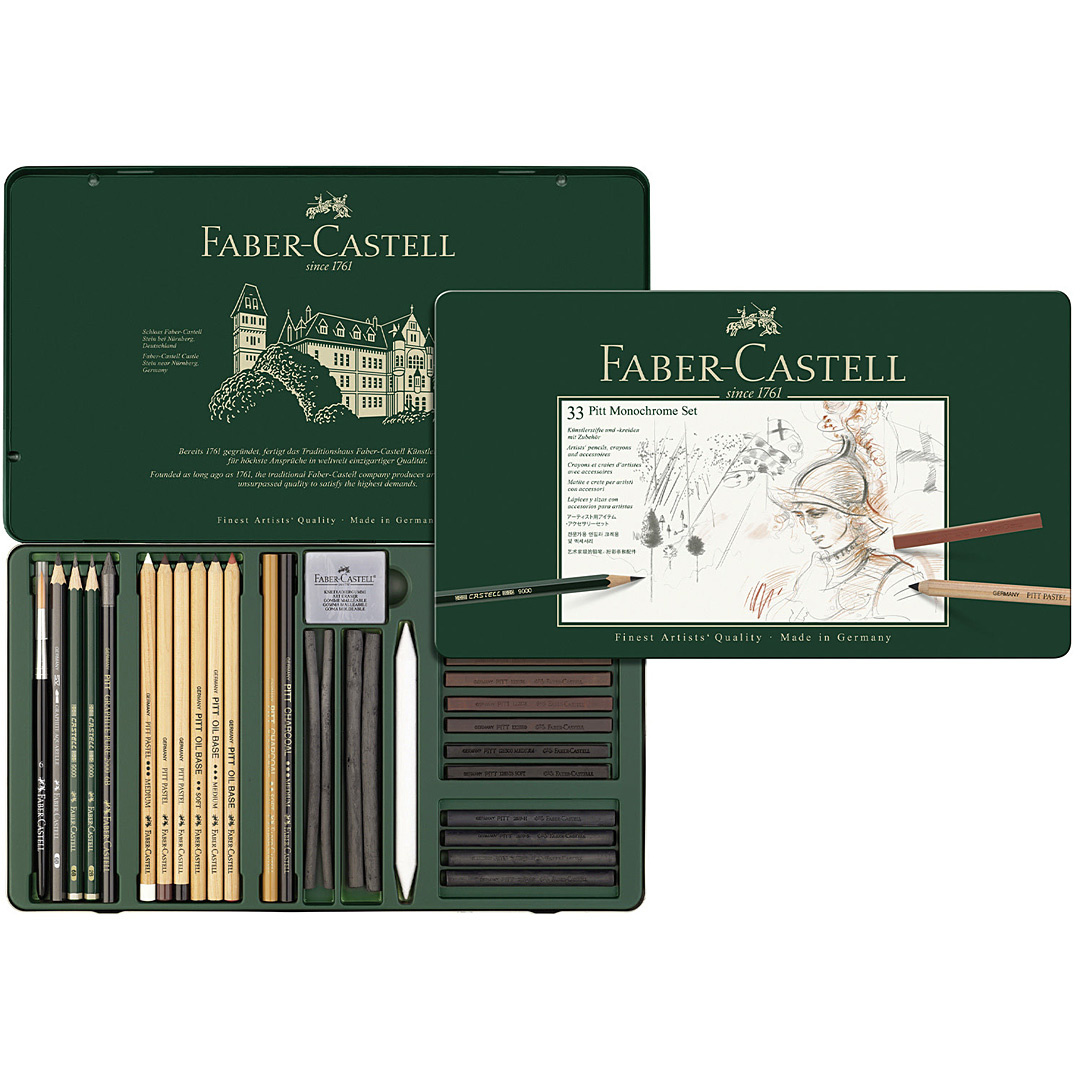 PITT Monochrome er et praktisk kunstnersæt, som indeholder pastelpenne, pastelkridt, grafit, kuglepen, naturligt kul, papirstub (estompe) og knetgummi. I alt 33 dele, der er pakket i holdbart metaletui. Produceret i Tyskland.