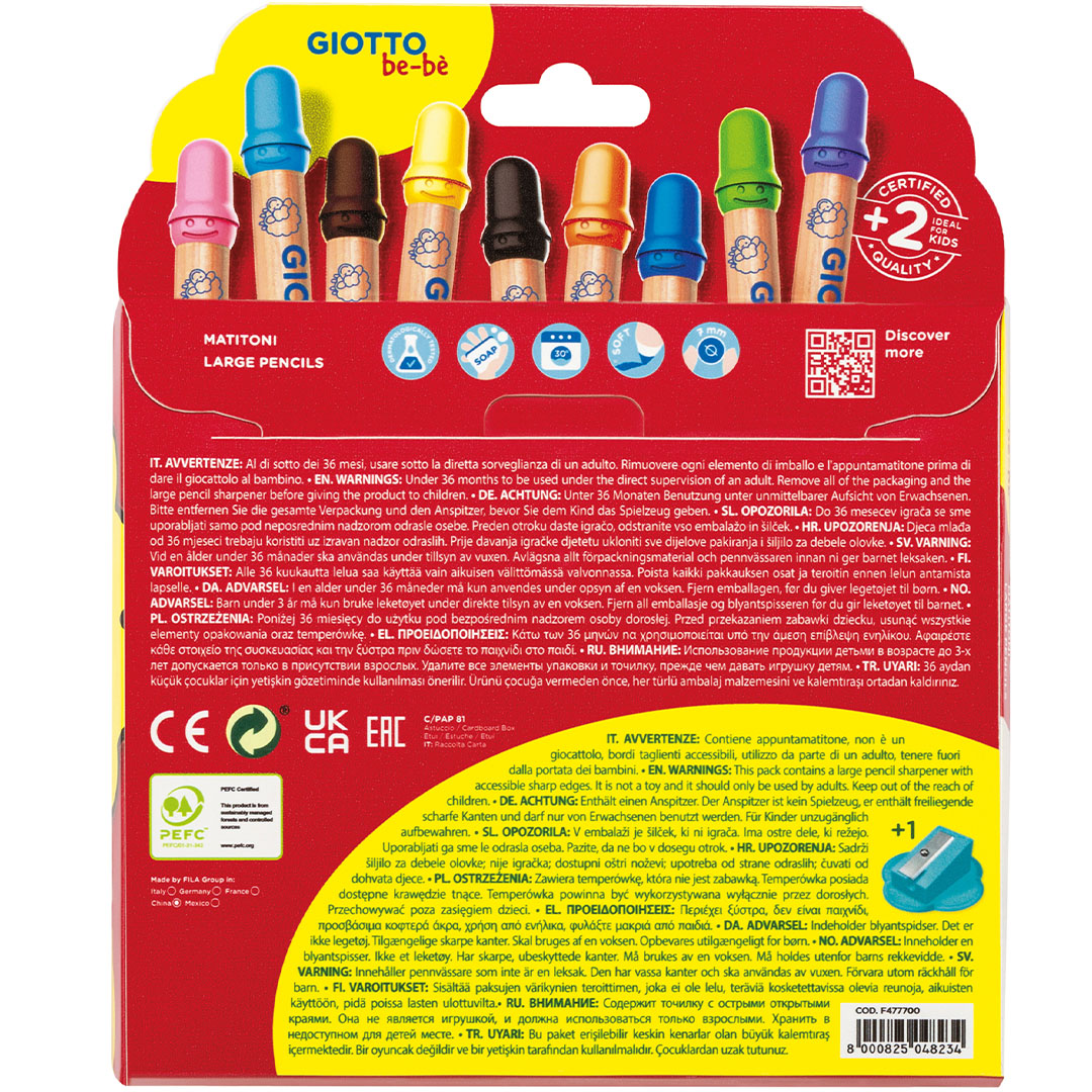 Korte, tykke farveblyanter egnet til børn fra 2 år. Med beskyttelseskappe. Let at gribe og farven er let at vaske af, hvis den kommer på tøj.