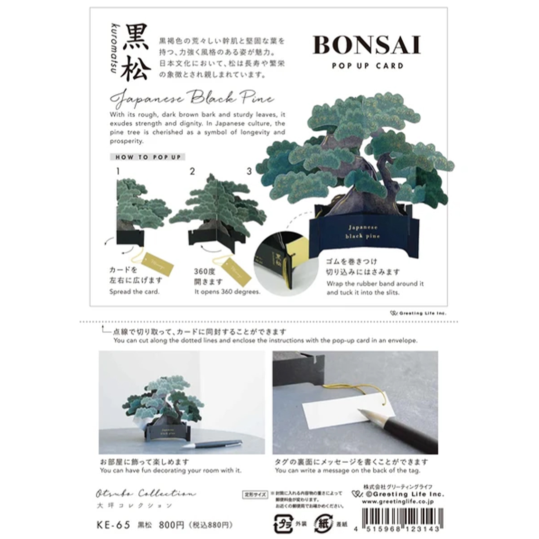 Dette popup-kort forvandles til et tredimensionelt bonsaitræ når det foldes ud. Kortet åbner 360° fra foldet tilstand og står da åbent som en smuk dekoration. Etiketten indeholder ordet message. Konvolutstørrelse: H173 x B120 mm