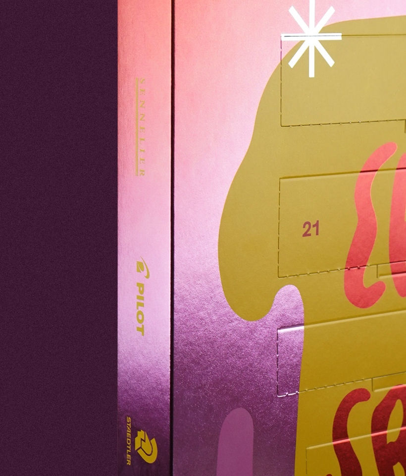 Årets kalender skinner som en julekugle og rummer produkter fra nogle af de fremmeste producenter: Sakura, Aquafine, Sennelier, Platinum, Staedtler, Sharpie, Primo, Pilot, Amsterdam, Leuchtturm1917, Lyra, Stabilo, Giotto, ZIG Kuretake, Ecoline, Rhodia, Raphael og Blockx.