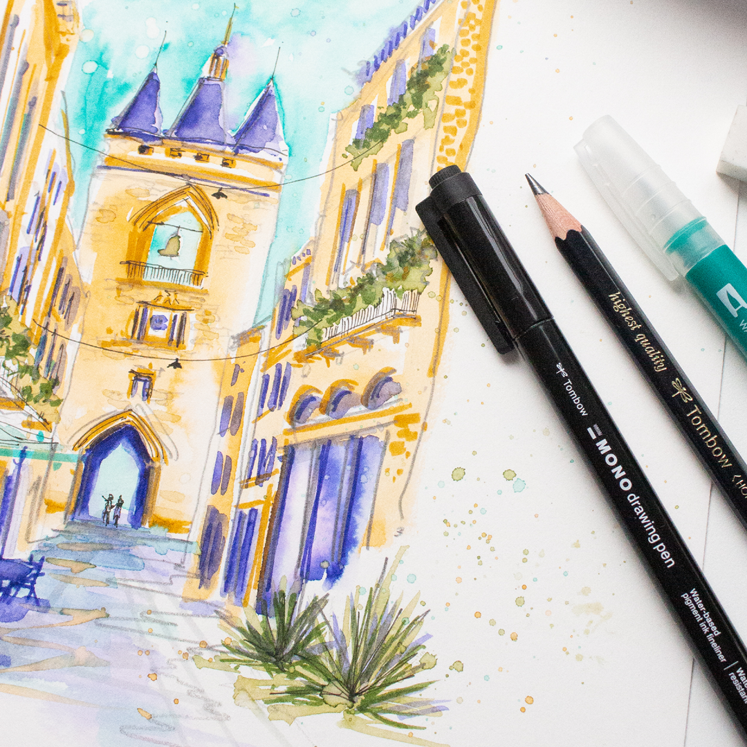 Husk, at der ikke findes nogen regler for, hvilke materialer du skal bruge til urban sketching. Selvom blæk og akvarel er almindelige alternativer, er der mange, som lige så gerne pakker farveblyanter, kridt eller andre favoritter. Det vigtigste er, at du bruger noget, du trives med, og som gør det nemt faktisk at komme i gang.