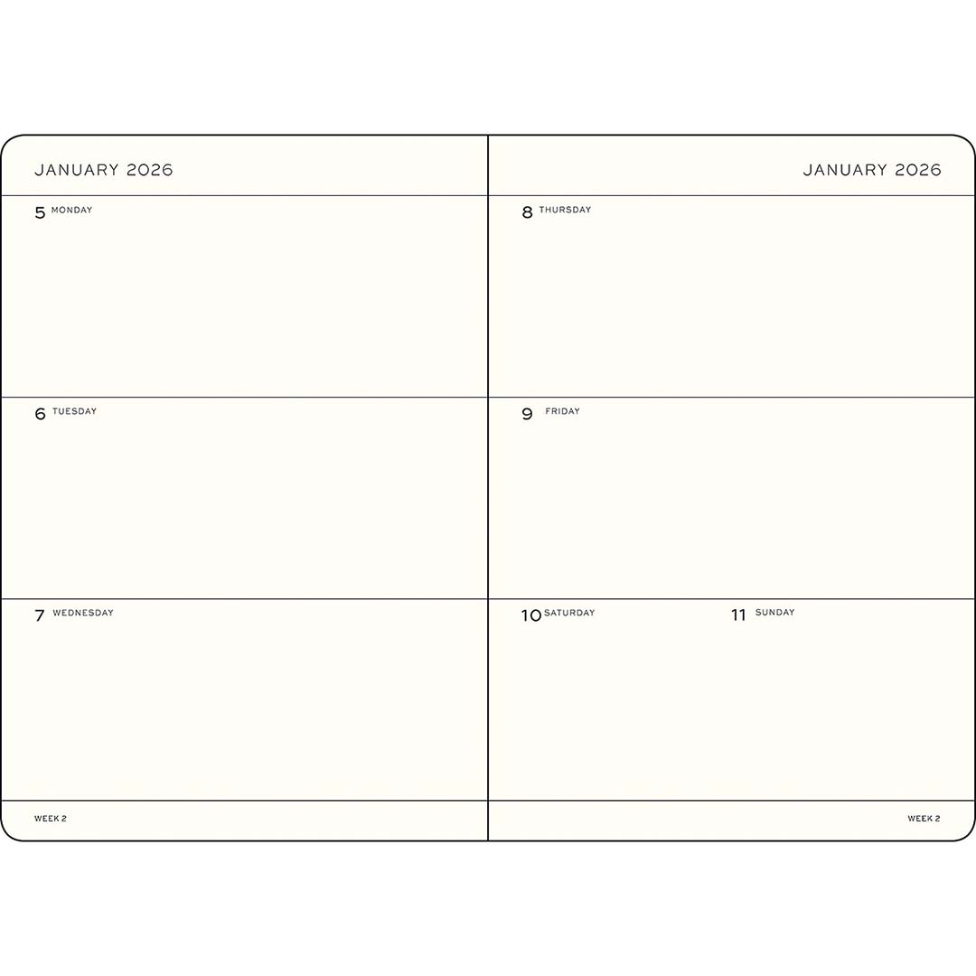 Planlæg dit år med en kalender fra Leuchtturm1917 i A5-format med hårdt omslag. "Weekly Planner" har et ugeoverblik pr. opslag med god plads til planlægning, organisering og notater.
