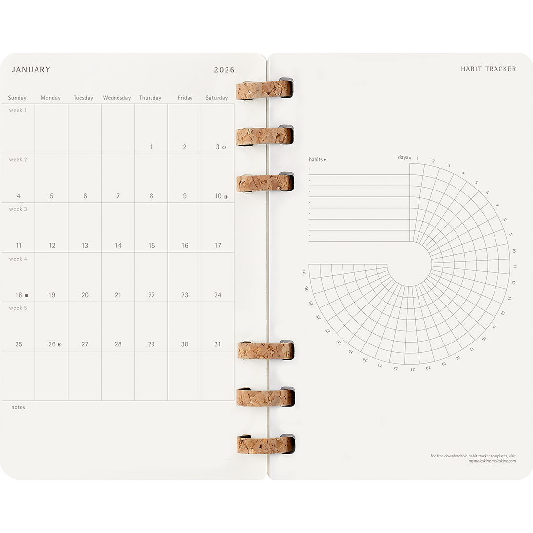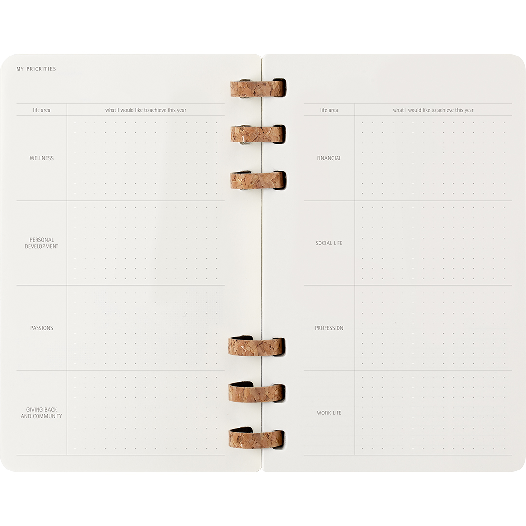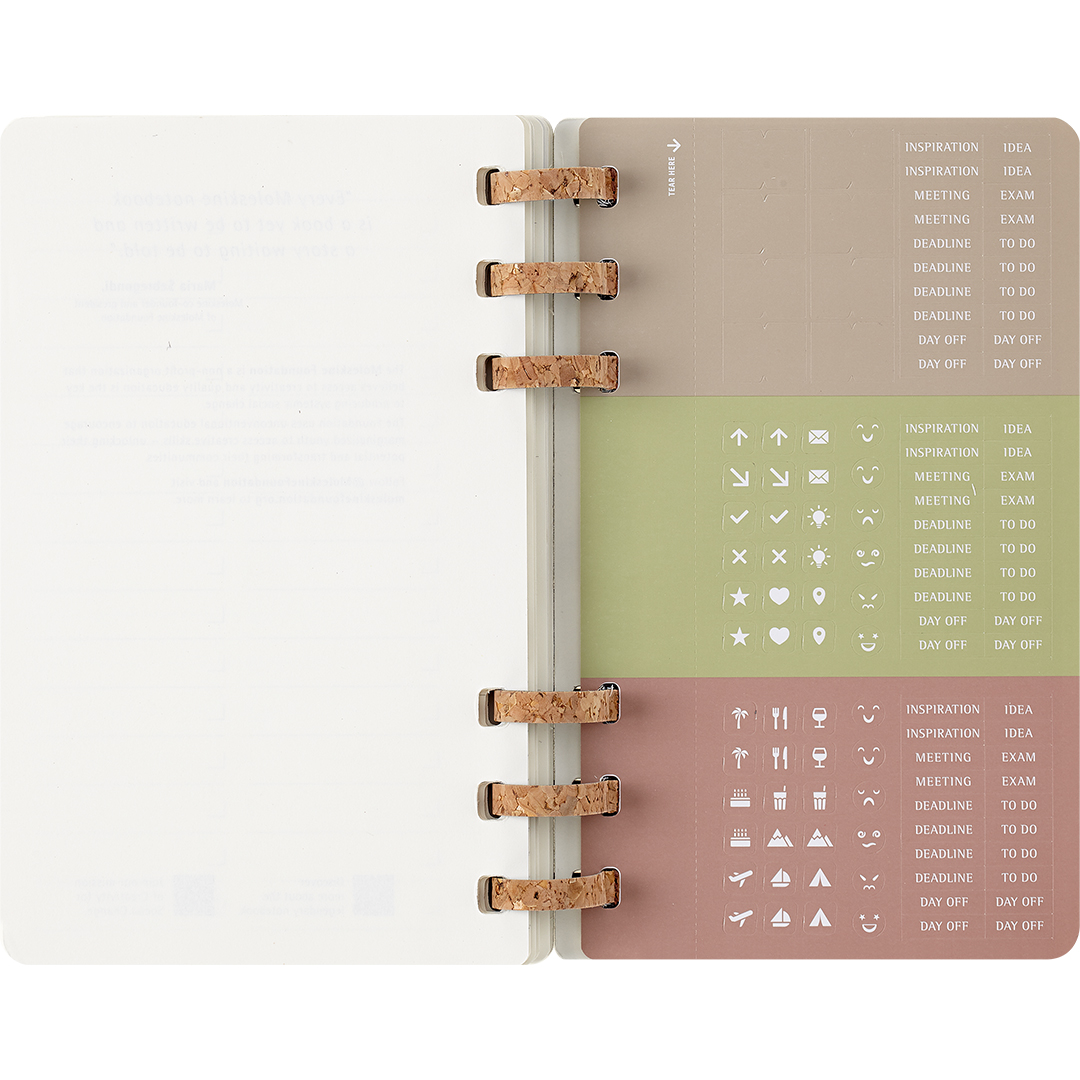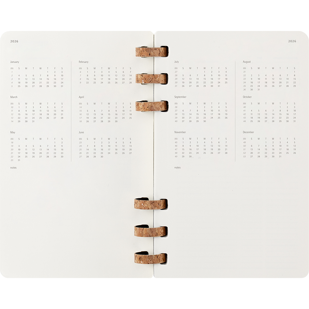 Med spiralryg i trendy kork og fremstillet af miljøvenligt 100 g 'Remake'-papir af høj kvalitet fra det italienske firma 'Favini Paper'. Denne kalender kombinerer måneds- og ugeplanlægning og giver rigelig plads til at skrive og planlægge og er godt designet til at understøtte studielivet.