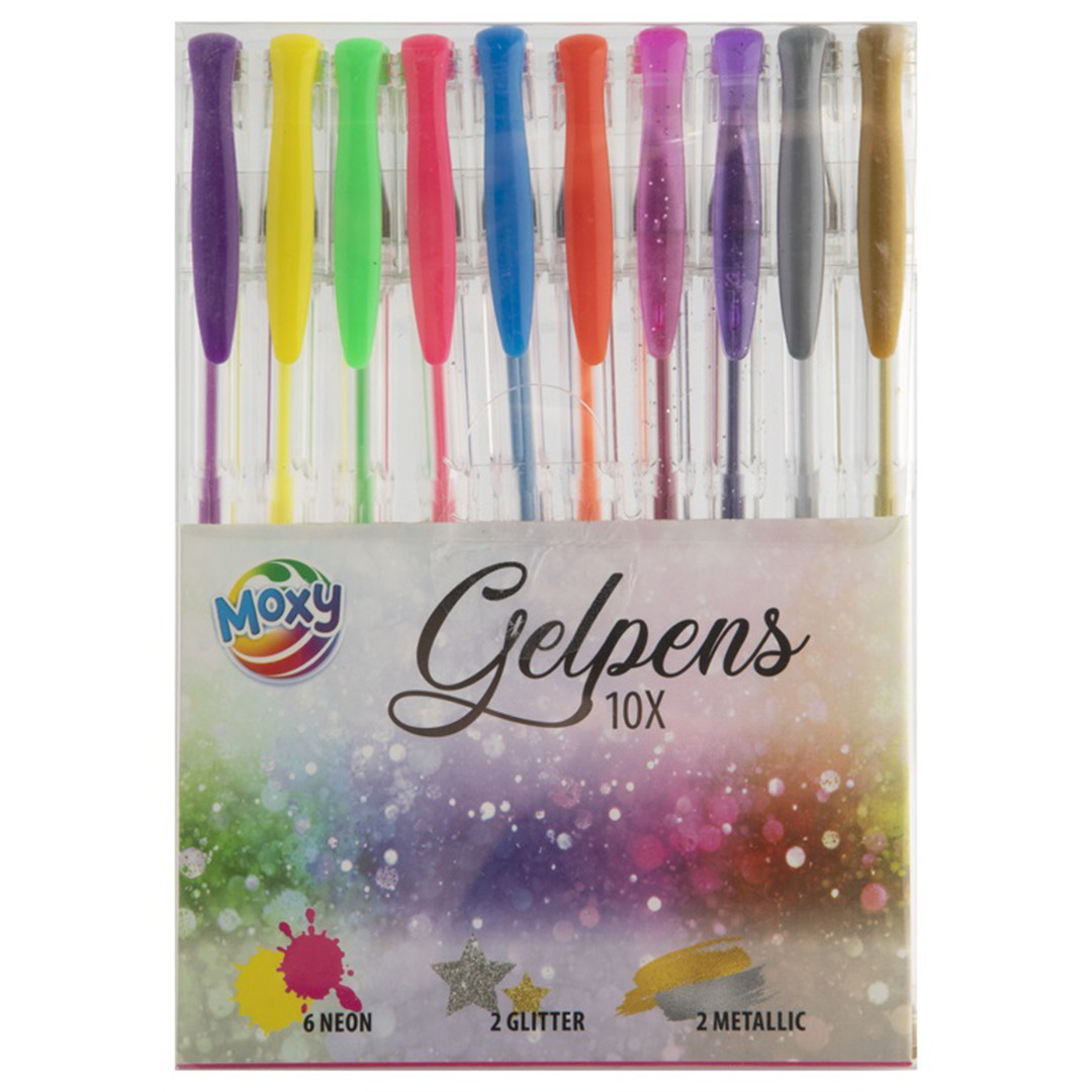 Et sæt med 10 forskellige farver gel penne! Sættet indeholder neonfarver, glimmer og metalliske farver. Sjovt at både farvelægge og skrive med, da de skriver så blødt. Lad din kreativitet skinne med disse gel penne, perfekte at tage med på farten takket være emballagen!