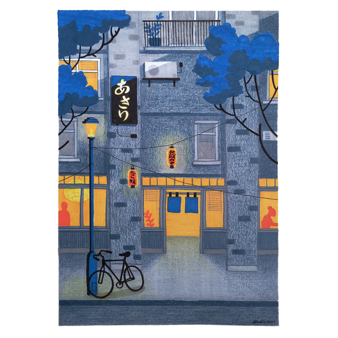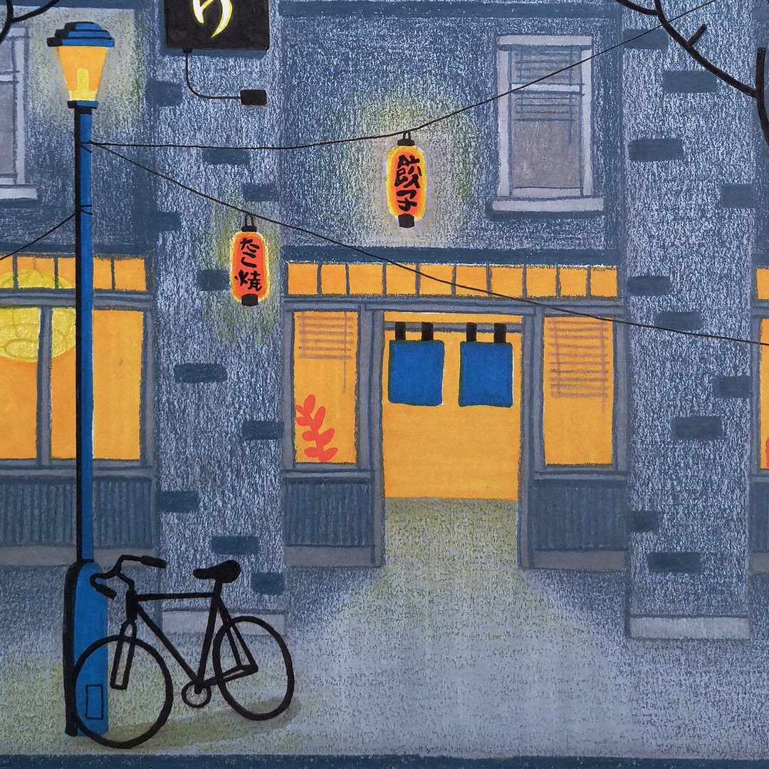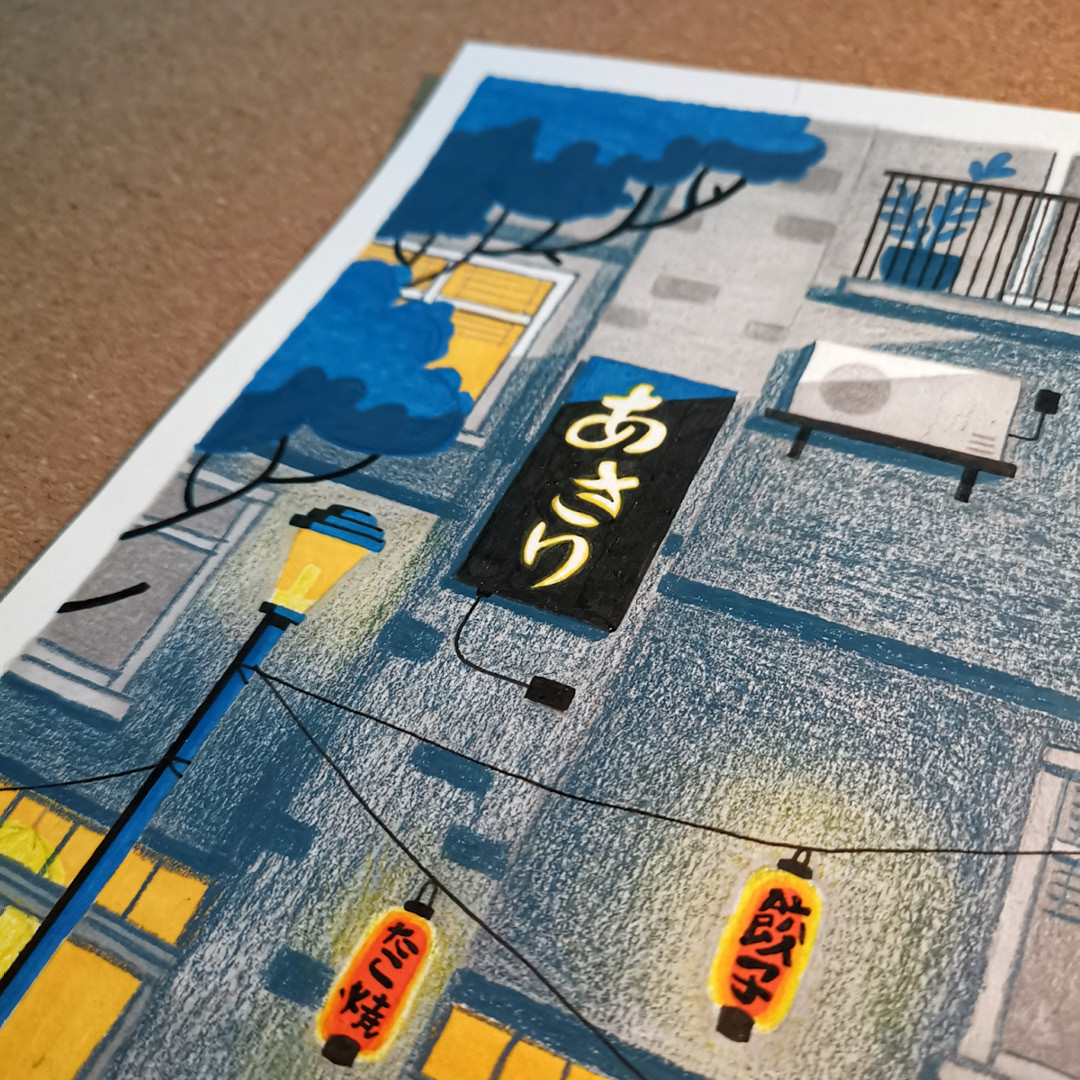 Motivet var i høj grad inspireret af selve pennene. De mørkeblå toner kombineret med kraftige gule og orange farver mindede mig om en aften i livlige bygader. Jeg ønskede at illustrere livet en mørk aften. Samtidig ville jeg have, at pennenes farver og teksturer skulle træde tydeligt frem. Derfor valgte jeg et fladt motiv, hvor perspektivet ikke tog opmærksomheden fra værkets farver og tekstur.
