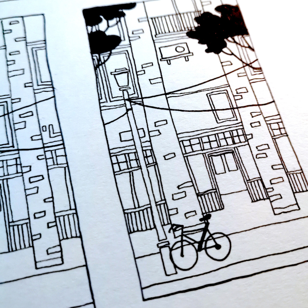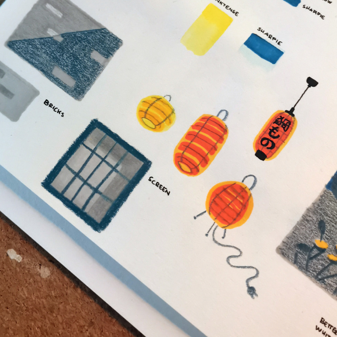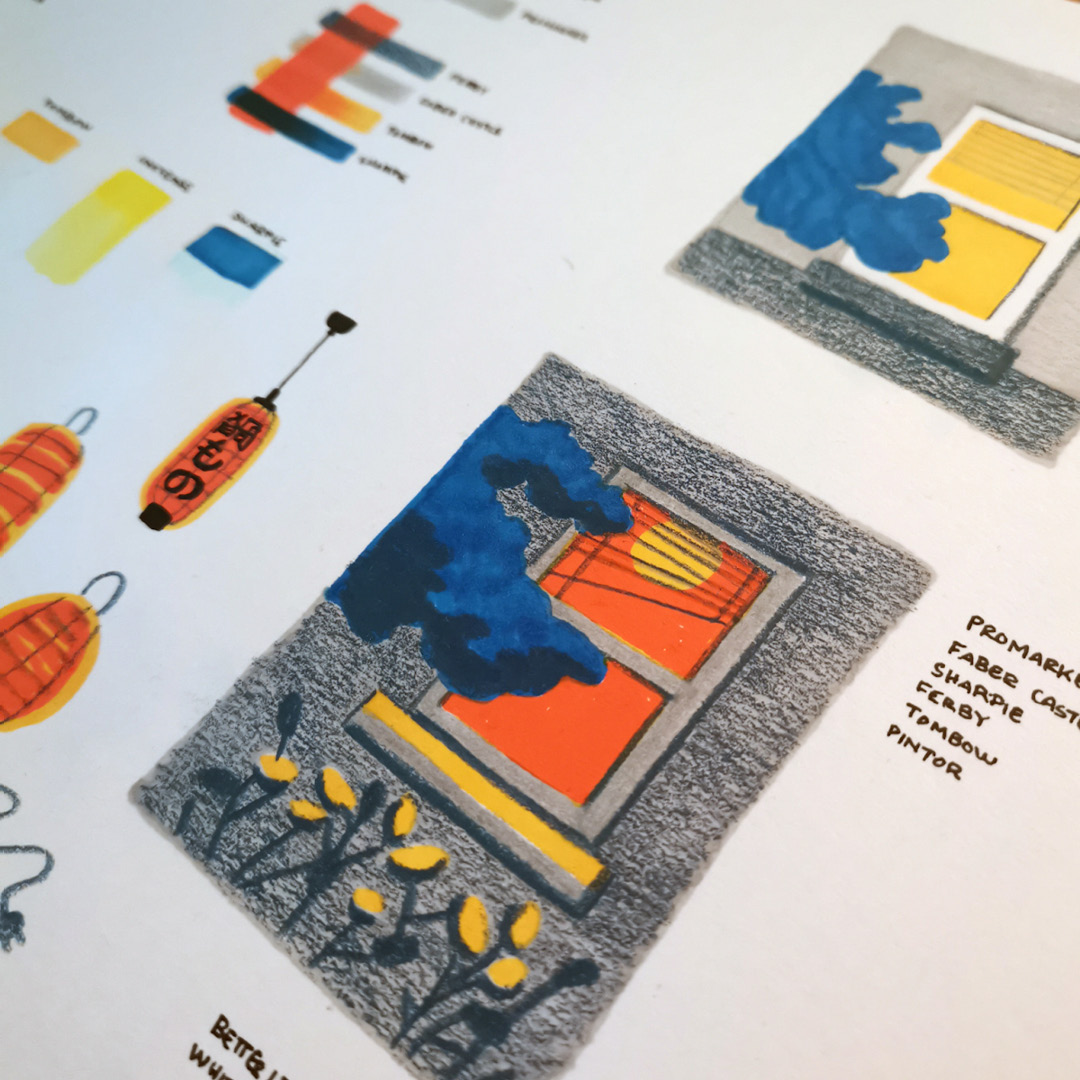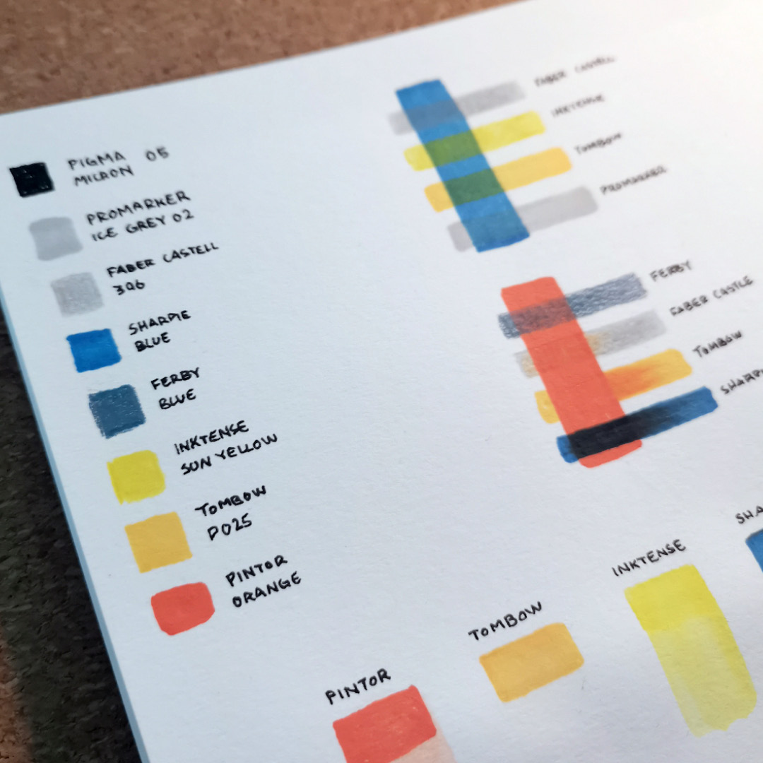 Jeg kendte til nogle af pennene i forvejen, men de fleste var nye for mig. Så snart jeg modtog dem, begyndte jeg at lave farvekort med de forskellige farver. Jeg afprøvede forskellige kombinationer og lagde flere af dem oven på hinanden. Da jeg havde lært pennene at kende, begyndte jeg at beslutte mig for, hvad jeg ville tegne.