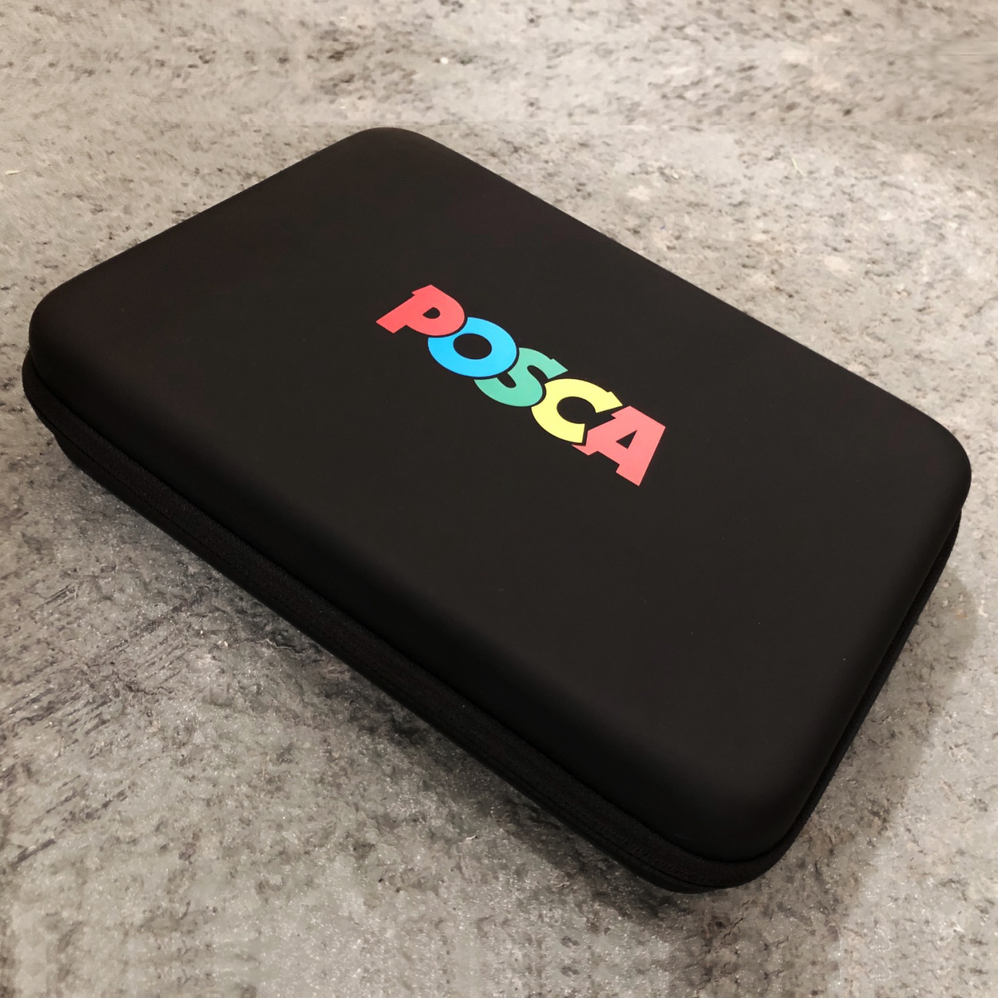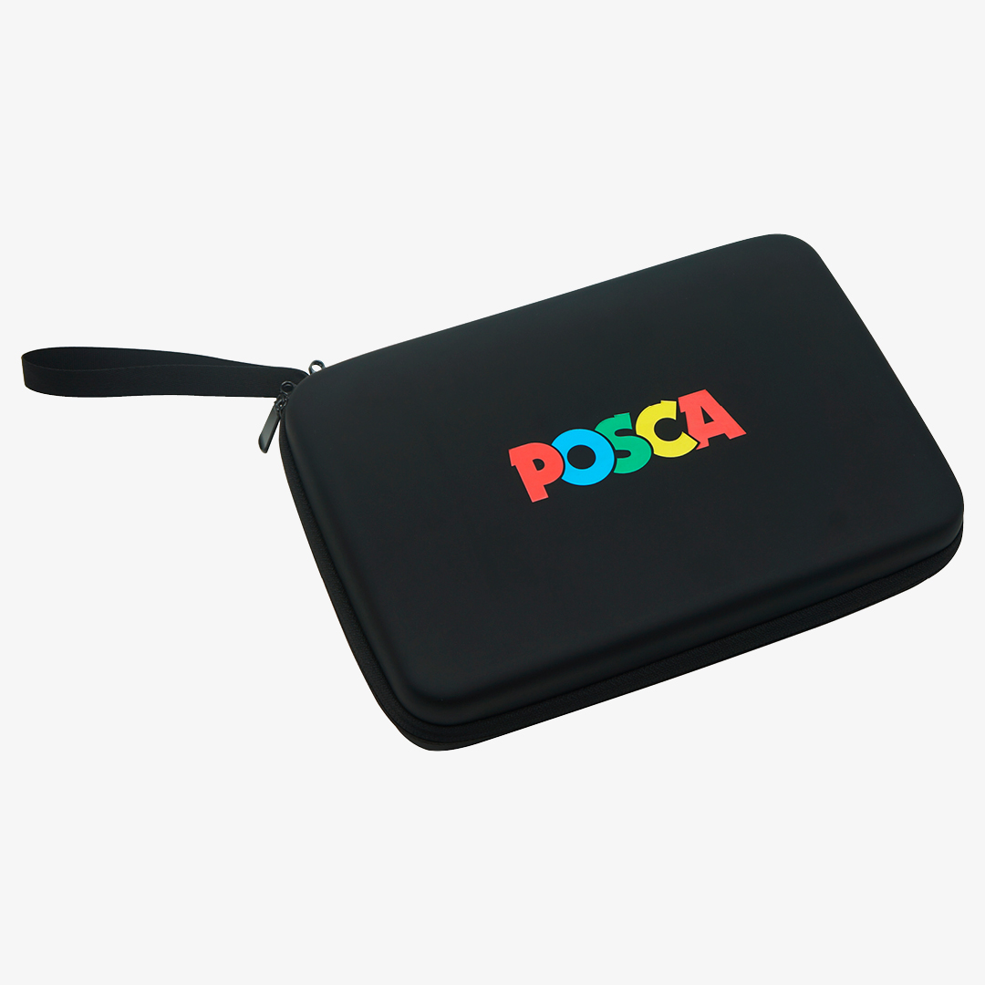 Leveres i et robust, kvalitetsmæssigt og stabilt etui med hård yderside og gummieret overflade. Lynlås, rem til at bære i og Posca-logo trykt på forsiden.