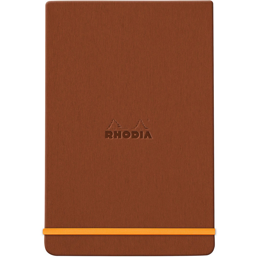 Bogen har et hårdt omslag i italiensk kunstlæder med et præget Rhodia-logo, hvilket giver den en elegant og professionel æstetik.