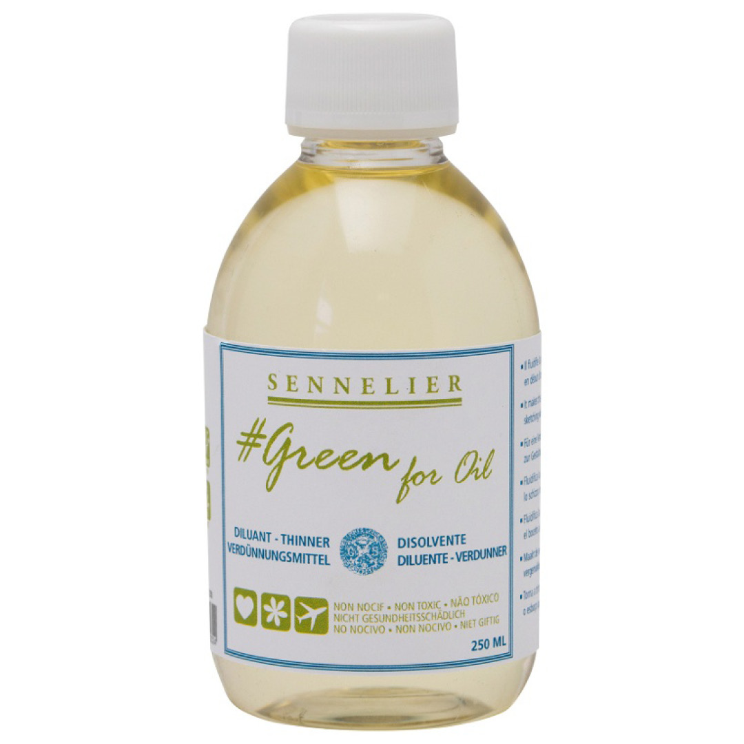 Green For Oil Thinner tilhører en moderne og miljøvenlig serie af oliemedier og fungerer som et universalmedie. Med dens minimale miljøpåvirkning har mediet samme funktion som traditionelle oliemedier. Serien indeholder ingen organiske opløsningsmidler og har tanke på miljøet, lige fra råmaterialet til det færdige produkt.
