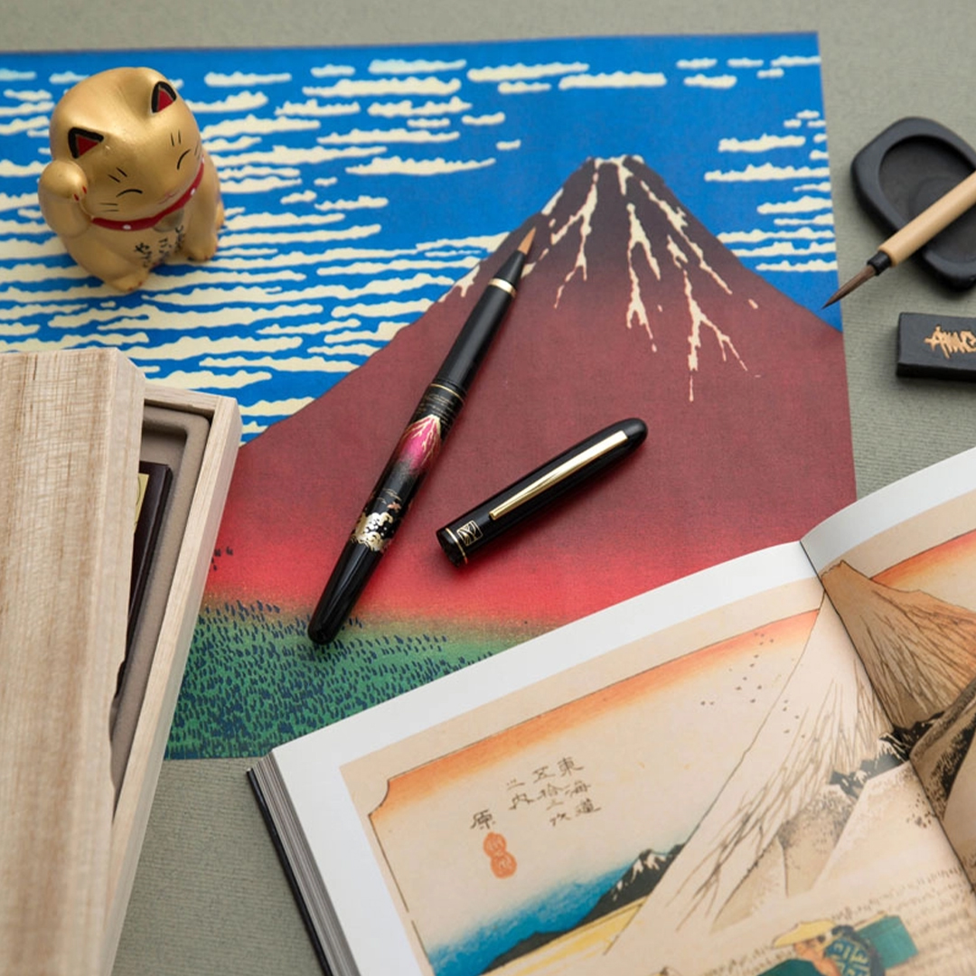 Kuretake Mannen Mouhitsu ”Makie-Monogatari” er en luksuriøs serie påfyldelige penselpenne med traditionelt japansk design inspireret af maki-e, den udsøgte lakteknik, hvor guld- og sølvpulver påføres i tynde lag for at skabe skimrende, dybe mønstre på mørke overflader. Pulveret består af ultrafine flager eller granulater fra bladguld/sølv, som påføres i lak og poleres for skimrende effekt.