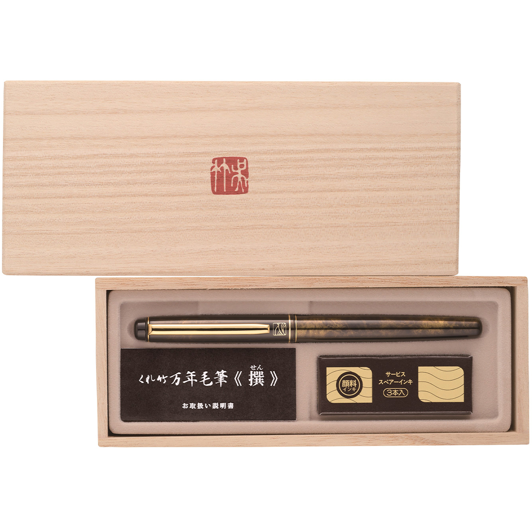 Kuretake Mannen Mouhitsu "Sen Bekkou-cho" er en efterfyllbar premium-penselpen med elegant design inspireret af traditionel japansk æstetik. Den har en syntetisk penselspids af elastiske polyesterbørstehår, der giver exceptionel fleksibilitet til linjevariationer fra meget tynde til brede streger.